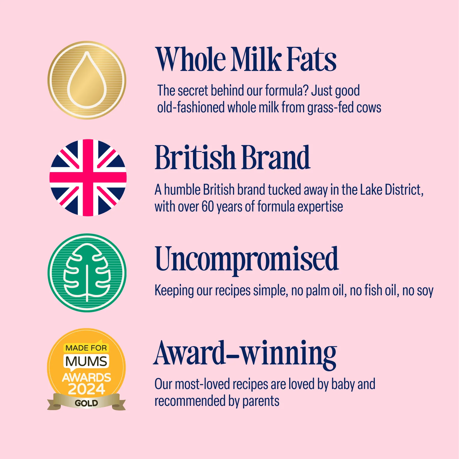 We’re 100% British and don’t do palm oil, fish oil or other cheap additives. What we do do is locally-sourced whole milk, plant-based DHA and 3’-GL. Simple.